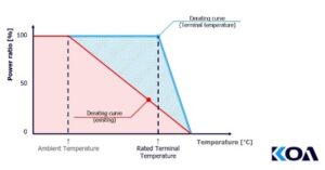 Für Dickschichtwiderstände liegt die Rated Ambient Temperature in den meisten Fällen bei 70⁰C, für Dünnschichtwiderstände bei mehrheitlich 85⁰C. Oberhalb dieser Temperaturen darf das Bauteil nur noch mit zunehmend geringeren Leistungen belastet werden.